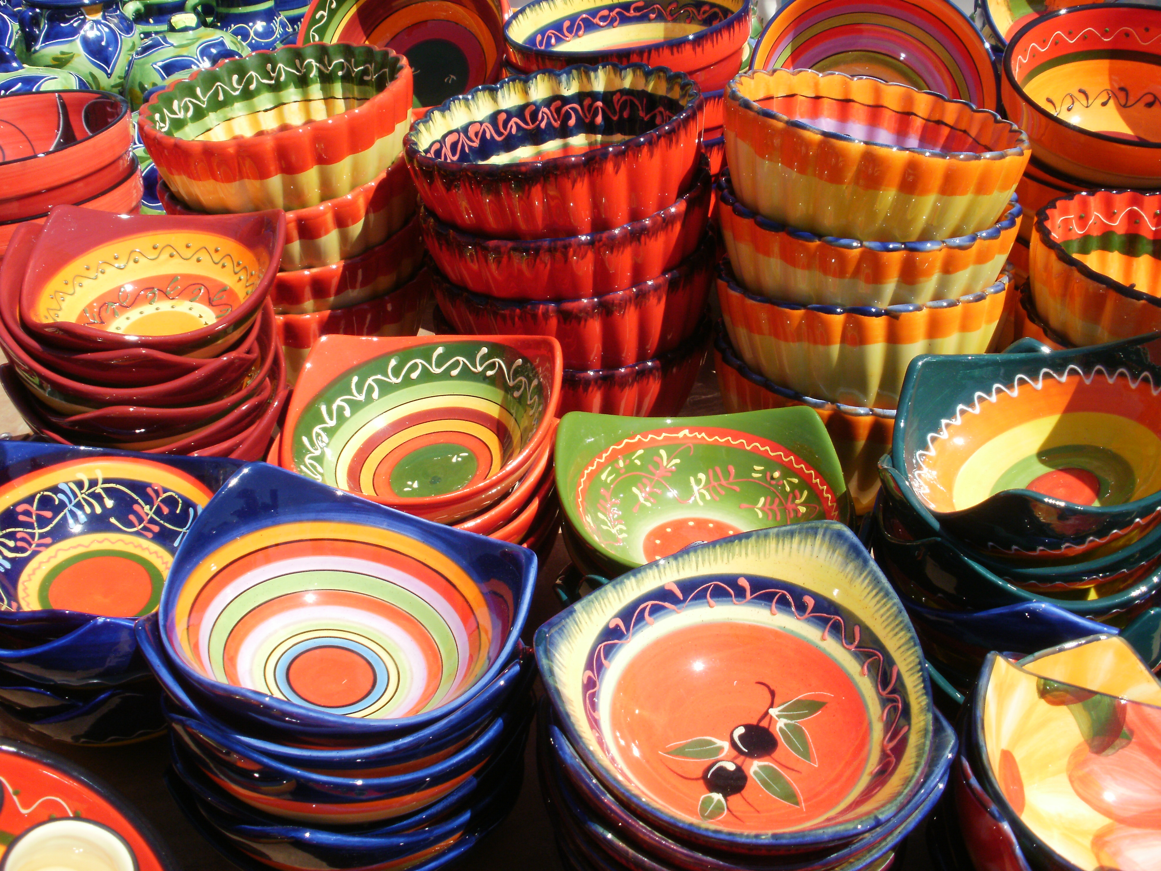 Items for sale include brightly painted pottery, locally grown fruit and sometimes irregularly-shaped vegetables, spices, olives and nuts, as well as clothing, handbags, shoes and jewellery.