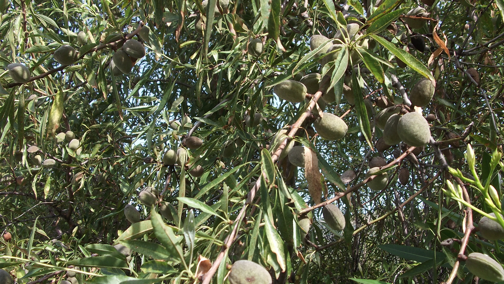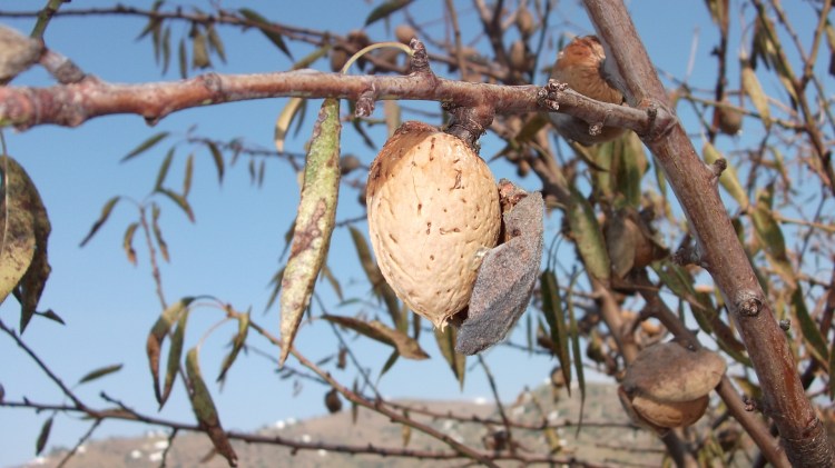 Finally, at the end of a long hot summer, the green velvety cases have dried and cracked open, to reveal and shell of the almond nut inside. Ready for the picking!