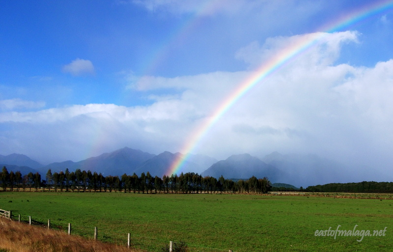 Rainbow on the road to Doubtful Sound, New ZealandWe start off in Fiordland, on the South Island of New Zealand where we had an early start for our journey to Doubtful Sound.  A storm had been lashing the area overnight and, as I am a strictly fair-weather sailor, I was feeling rather nervous at this point.  However, my fears were soon calmed, because almost as soon as we were picked up from our hotel, the skies began to clear, the sun came out and we were rewarded with this most spectacular rainbow!