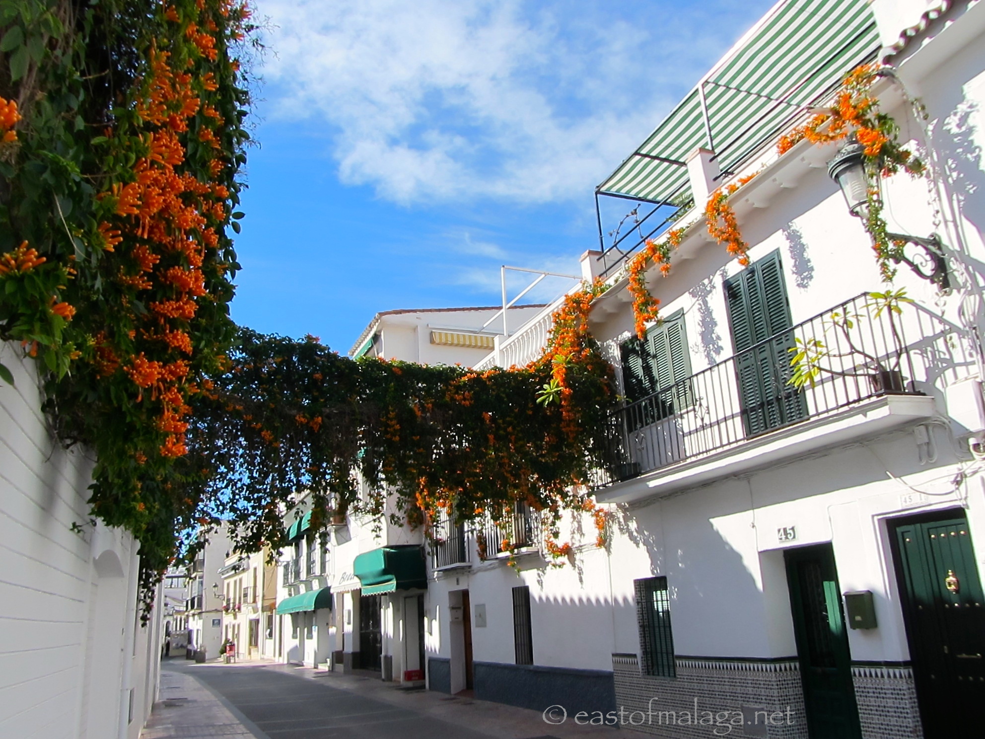 This particular magnificent flowering vine with it’s brilliant orange flowers can be found draped across Calle Carabeo in Nerja.    The Orange Trumpet Creeper is a vigorous evergreen climber which grows well in a warm climate, needing shelter from cold winds or frost.