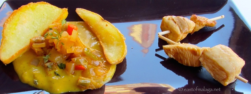 “Mini brochetas de polo braseado con salsa Tikka Masala y patatas artisanas” is a delicious chicken curry dish from Mi Mundo, Avda. Toré Toré 16.