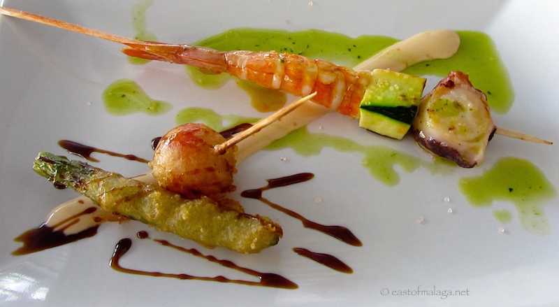 “Brocheta marinera con verduras en tempura y mahonesa de marisco” , is a delicious fish-skewered tapa from Casa Andrés, Paseo de Larios 36.
