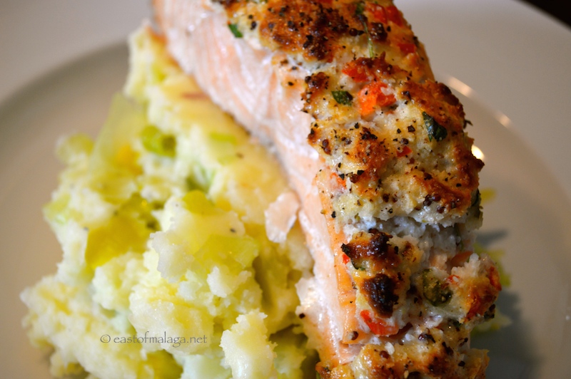 After three or four minutes, the crust on the salmon was just starting to brown nicely, so it was time to serve the leeky mash into bowls and drape the salmon artistically on top!