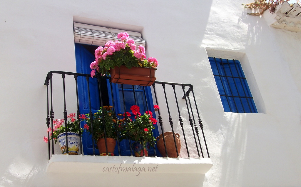 My final image is from my home village of Cómpeta, showing a pretty balcony, filled with flowers, against the deep blue painted windows as their background.