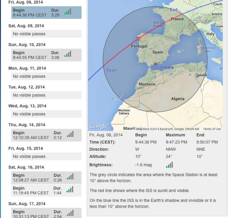 In the photo above, you can see that for my location in Cómpeta, Spain there was an ISS pass last night (Friday August 8th) at 9.44pm lasting 5 minutes and 29 seconds with 2 green bars for brightness. My next best chance to view the ISS is next Saturday night (16th August) at 11.19pm.