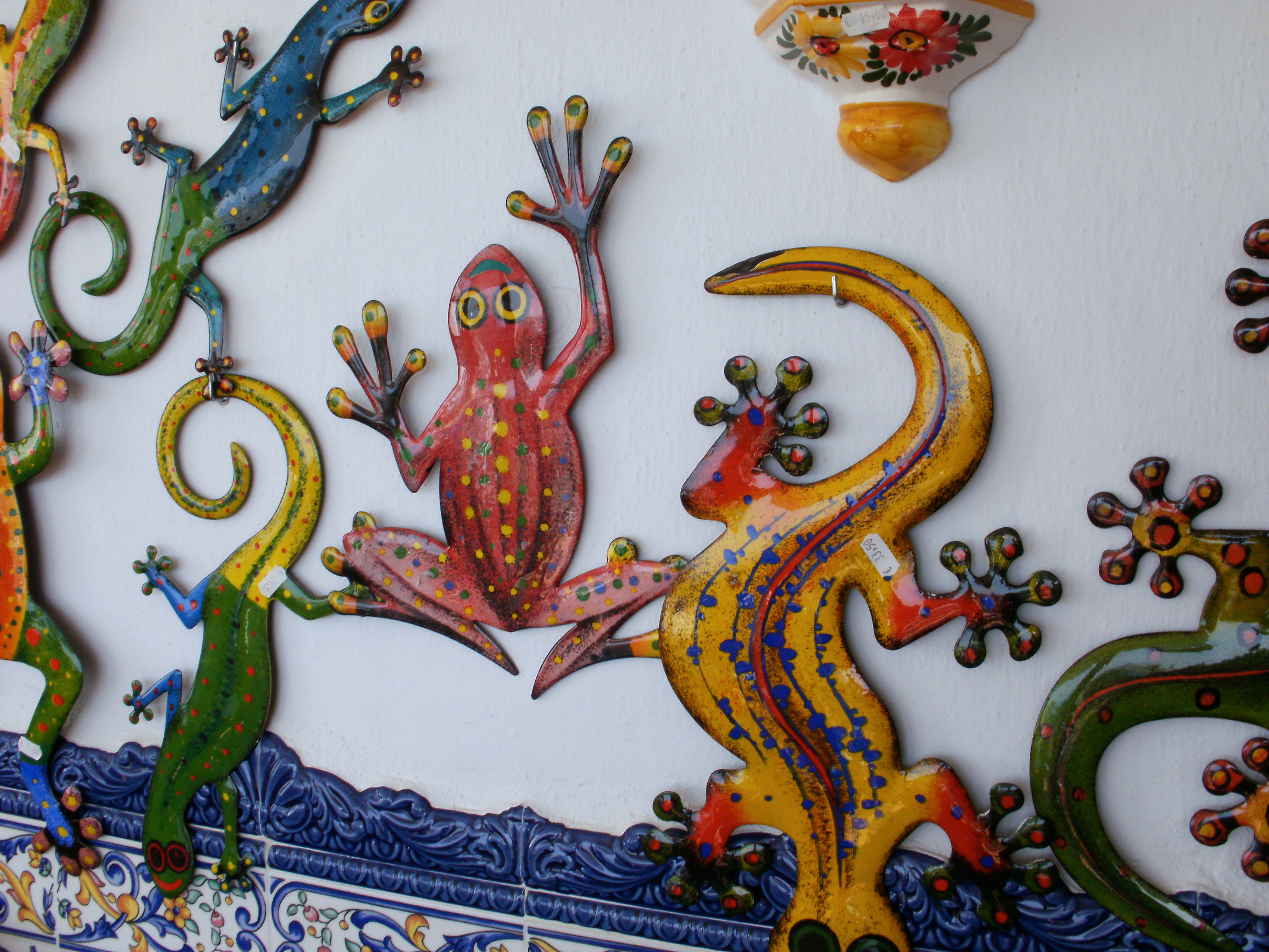 These colourful items were for sale in one of the little tourist shops in the pretty village of Frigiliana. But you also get a glimpse of the beautiful tiles adorning the lower part of the wall on the outside of the building.